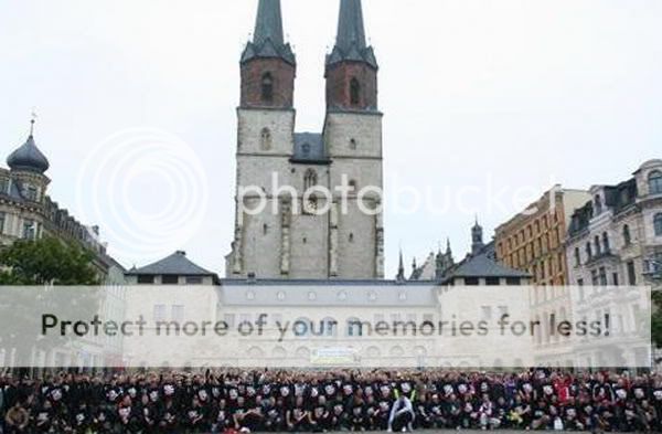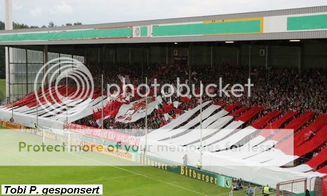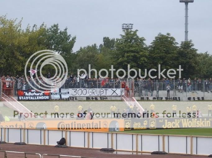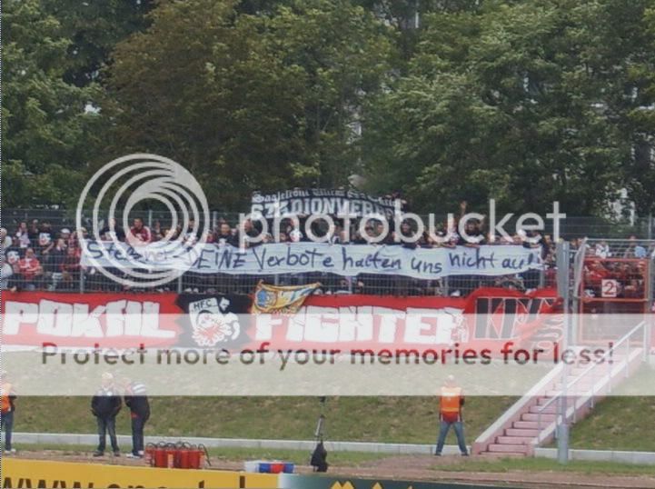 auf Seiten dieser so genannten Journalisten nicht in Dessau angefragt ob das denn wirklich ginge und hätte man dort nicht seine Szenarien von Tod, Hass und Zerstörung vorgegaukelt, dann hätte der HFC in Dessau gespielt und es wär ein Fest geworden. Ich persönlich hatte zum Schluss gar keinen Bock mehr auf dieses Spiel und wollte nur alles schnellstens hinter mich bringen. Schließlich ist das mein Verein und am Ende will ich doch nur das Beste für meinen Klub. Am Morgen vor dem Spiel erwachte ich aus dem kurzen Schlaf und schaute aus dem Fenster, Regen und Wind…prima. Trotzdem zog es mich auf den Hallmarkt wo das große Treffen samt Mottoshirtverkauf und Mobfoto von statten ging. Bis zu 400 Leute sammelten sich hier an ehe es später gemeinsam zum Ground gehen sollte. Die Bullen kamen heute auch aus allen Himmelsrichtungen des deutschen Landes und so kam man auch pünktlich an. Erklären wie diese Hütte aussieht möchte ich hier nicht, denn jedes Wort über dieses so genannte Stadion ist eins zu viel. Naja ok, wenigstens existieren die Klappsitze aus dem alten KWS noch. Der Rest ist eine Zumutung für jeden Fan. Was solls, es ging an die Vorbereitung fürs Spiel und die Atmosphäre hätte ruhiger nicht sein können. Das Spiel war dann Gott sei Dank das ganze Gegenteil. Der HFC spielte Frankfurt die erste Halbzeit an die Wand, doch Tore wollten nicht fallen. Mit 0:0 ging es in die Kabinen und Sportkamerad Veh muss ziemlich explodiert sein, denn Frankfurt übernahm nun das Kommando. Die Rot-Weißen waren stehend KO und auch der Trainer hatte nicht gerade das glückliche Händchen beim wechseln. Am Ende entschied Gekas per Elfer und einem Tunnler gegen „Horwat unser Torwart“ das Spiel. Schade es war mehr drin. Zur Stimmung kann und will ich nicht viel sagen. Für mich war es der beste Auftritt im Rattenkäfig von Neustadt überhaupt. Entscheiden sollen es aber lieber andere. Ob wir es wirklich gerissen haben sei am Ende dahingestellt. Die ersten fünf Minuten war es jedenfalls ruhig denn wir protestierten gegen einige SVs für die aktive Szene. Am Ende hat der dumme TV Mensch natürlich wieder alles falsch verstanden und man dachte es ginge um die Solidarität mit denen die keine Karten hatten. Sinnlos schlechter Journalismus wenn man mich fragt. Von Frankfurt kam nicht viel an. Man grüßte die Xten Menschen die angeblich draußen blieben, die Innenstadt aber nie erreichten. Die Ultras blieben fern und die paar Kutten am anderen Ende der Welt ähhh des Stadions brachten auch nicht viel zustande. Insgesamt war ich nicht nur froh, dass die Medien nichts mehr zu fressen bekamen sondern auch, dass dieser absolute Skandal endlich ein Ende gefunden hat. Viel los war nach dem Spiel nicht mehr und auch die Uniformierten durften nach einer 20 Stündigen Schicht endlich nach Hause touren. Mit der Leistung braucht man aber keinen Schiss vorm Produkt aus Leipzig oder den Störchen aus Kiel zu haben. Ich bin wie immer zuversichtlich. Danke noch an Frau S.C. für die zur Verfügung gestellten Bilder ;)