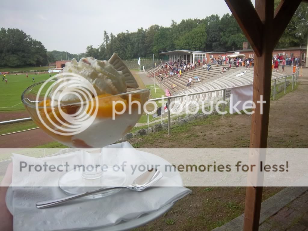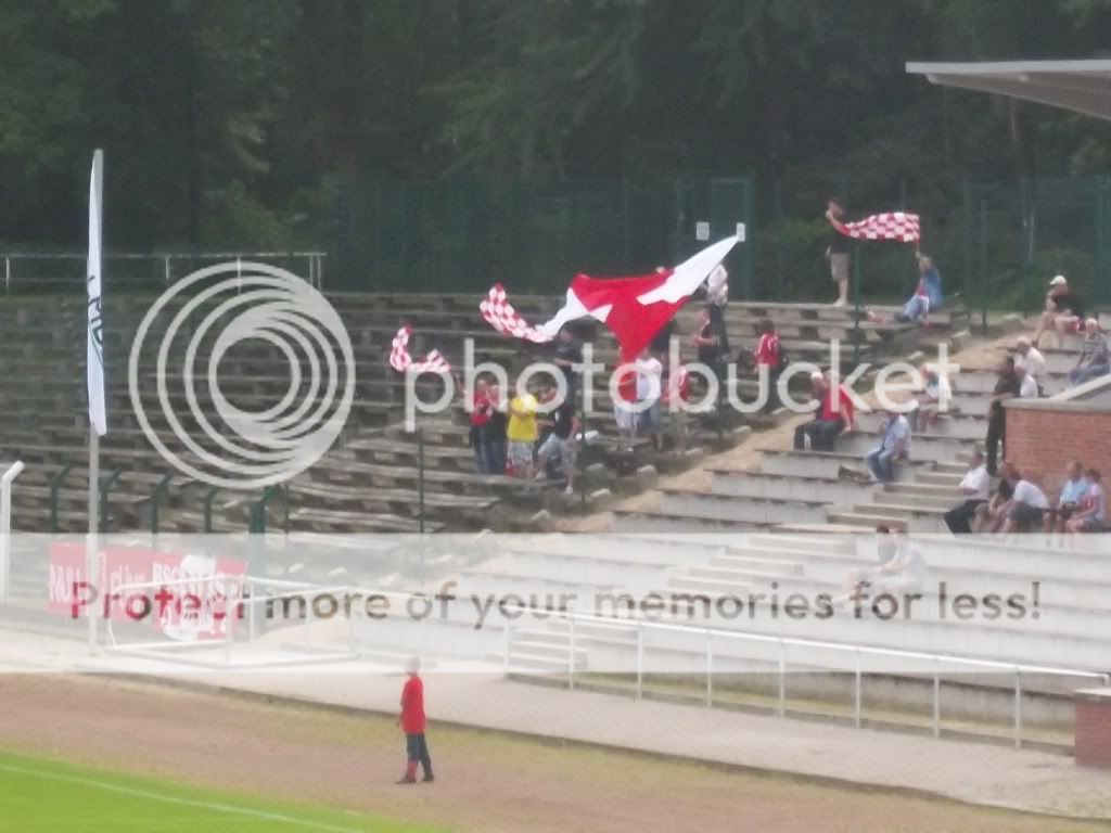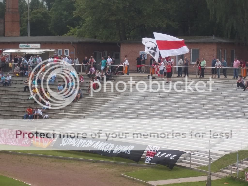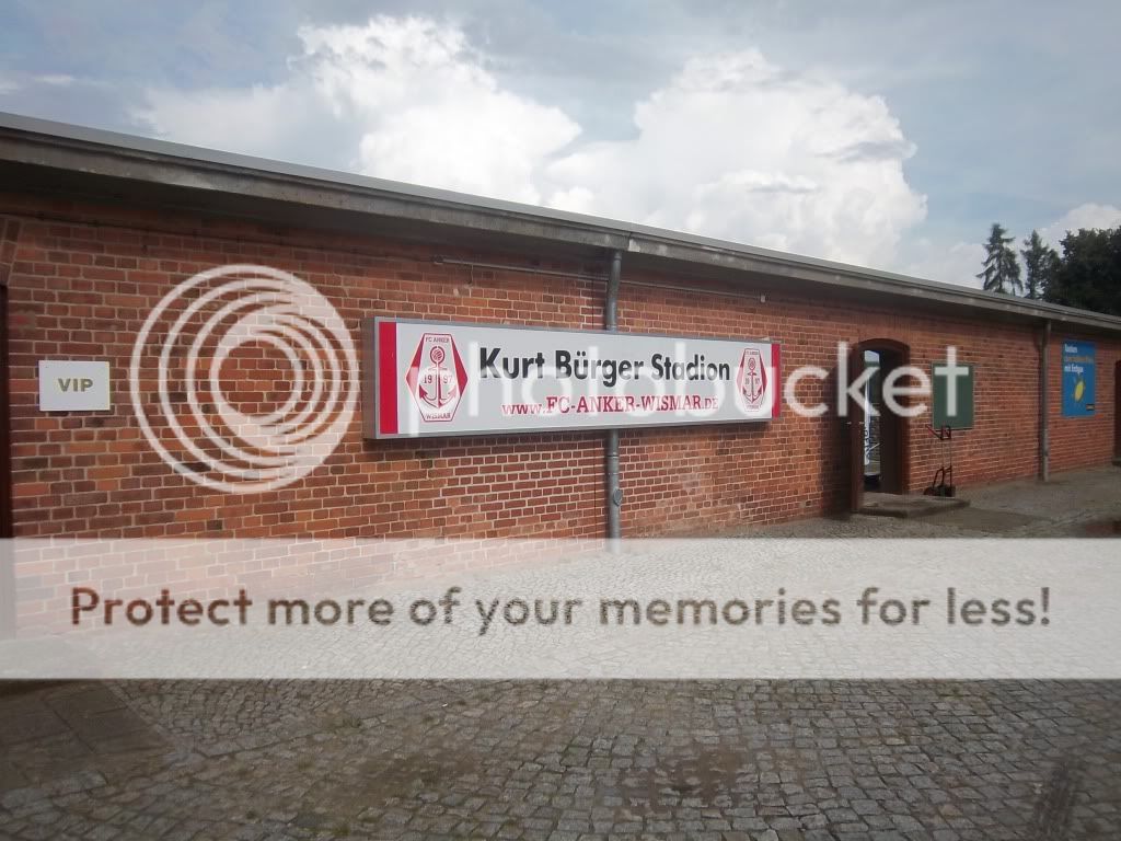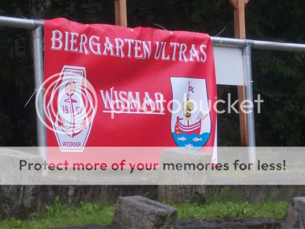 bangten und beteten, dass sie uns nicht noch durch die Stadt begleiten wollen. Dem war nicht so und wir konnten die Kulturreise durch die doch recht geile Altstadt alleine bewältigen. Nachdem wir noch den alten Holzhafen besucht hatten ging es zu Fuß weiter zum Ground wo man über eine Stunde vorm Spiel ankam. Das typische Küstenwetter trieb einen schon das Wasser zwischen die Schenkel und nach dem man sich im angrenzenden Supermarkt mit kalten Getränken versorgt hatte, betraten wir nun das Stadion. Für ganze 5,50 Euro gabs ne richtig schicke Karte und ein Programm, sehr schön. Trotz der finsteren Blicke einiger Hobbyhooligans von Hansa ließ ich es mir nicht nehmen den Ground näher unter die Lupe zu nehmen und ich muss sagen ein richtig geiles Brett was hier steht. In der Mitte findet man eine alte Tribüne mit Dach und Holzbänken. Links und rechts davon hat man noch alte Steinstufen und bis hinter beide Tore befinden sich noch die Überreste alter Sitzgelegenheiten. Ein altes Marathontor ist ebenso noch vorhanden wie der alte Kesselraum samt Schornstein. Genial. Zumindest in der ersten Hälfte gesellten wir uns hinter das Tor und das Spiel konnte losgehen. Brandenburg war anfangs klar die bessere Elf doch in Führung ging Wismar. Danach stellten die Gäste das Spielen ein und Wismar kam zu klarsten Chancen. Doch am Ende ist es immer das Selbe, wer seine Chancen nicht nutzt wird bestraft und so konnte Brandenburg den Ausgleich einschenken. Ziemlich bitter für Wismar, will man doch so dringend in die Regionalliga. Wenn das gelingen soll, sollte man so was wie hier abstellen. In der zweiten Hälfte zog ein schweres Gewitter über uns hinweg vielleicht hat es dem einen oder anderen Spieler elektrisiert. Bei der drückenden Hitze war es für mich heute nicht unbedingt angebracht die Bratwurst zu testen, ist diese doch sowieso nicht das Beste im Norden. Nein, wir gesellten uns in den angrenzenden Biergarten und für mich gabs