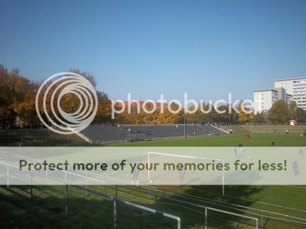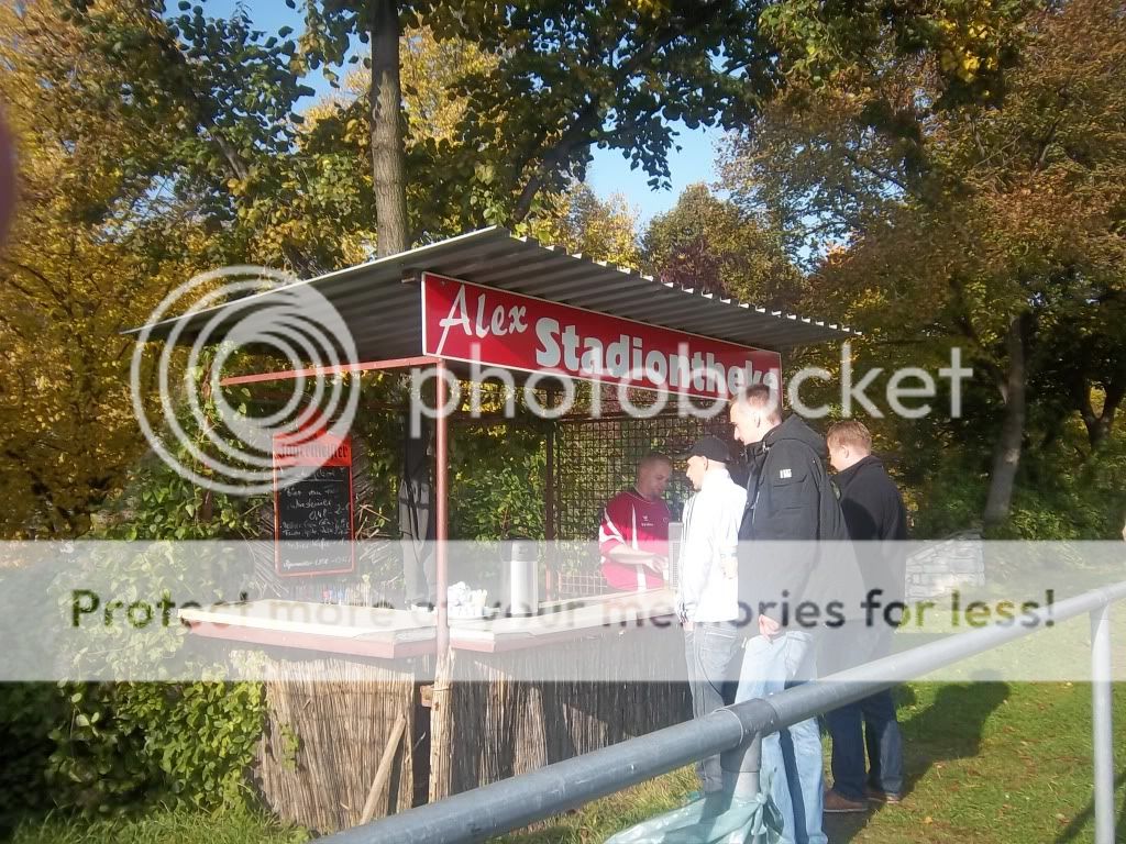 Abrisskarten gab, der Preis von 4 Euro stimmte allerdings. Grüße gehen hier noch an Ric der heute natürlich auch anwesend war. Die Bouletten am Imbissstand waren auch bereitet und so konnte der Kick vom Tabellenführer gegen den Vierten beginnen. Man muss sagen das Ergebnis täuscht etwas über das Spiel hinweg, verdient ist der Sieg von Mahlsdorf aber allemal. Lichtenberg verlor zu viel Zweikämpfe, hatte den Kopf wahrscheinlich schon beim Bier und hatte anscheinend auch keine Stürmer auf dem Feld. Die rote Karte wegen Nachtretens störte Mahlsdorf dann auch nicht mehr, hat man das Spiel doch mit nem 40m Lupfer endgültig in trockene Tücher gebracht. Für den neutralen Beobachter war das natürlich ein Leckerbissen, für die symphatischen Lichtenberger tats mir aber trotzdem leid, in der Oberliga würde ich die Truppe schon gerne wiedersehen. Gerade was den Ground betrifft braucht man sich nicht verstecken. Drumherum war auch nicht wirklich viel los. Im Heimblock fand man einige Zaunfahnen aber hier wurde sich aufs Fussball schauen verlegt und man freute sich sicherlich auch auf das Bier mit der Mannschaft welches nach dem Kick auf alle wartete. Mir war das nix, ich verabschiedete mich nach dem Spiel und in getrauter Zweisamkeit genossen wir noch die Idylle Ostberlins ehe es in den Abendstunden wieder in die hallesche Heimat ging.